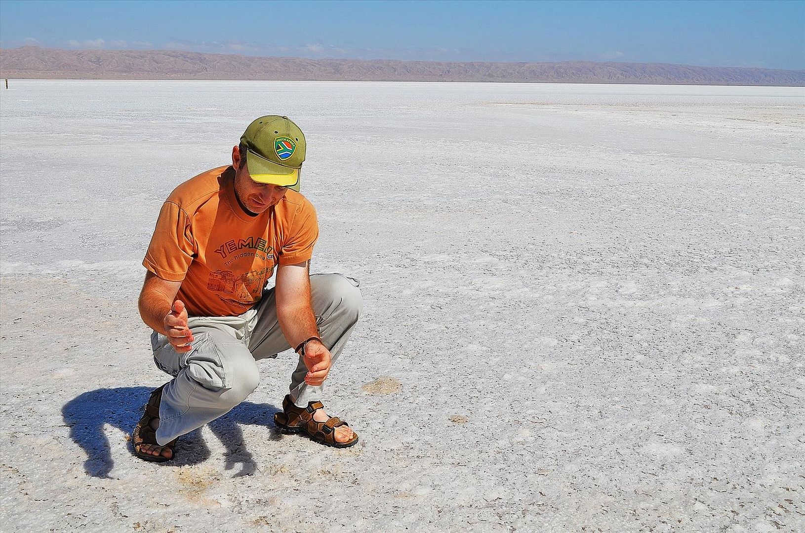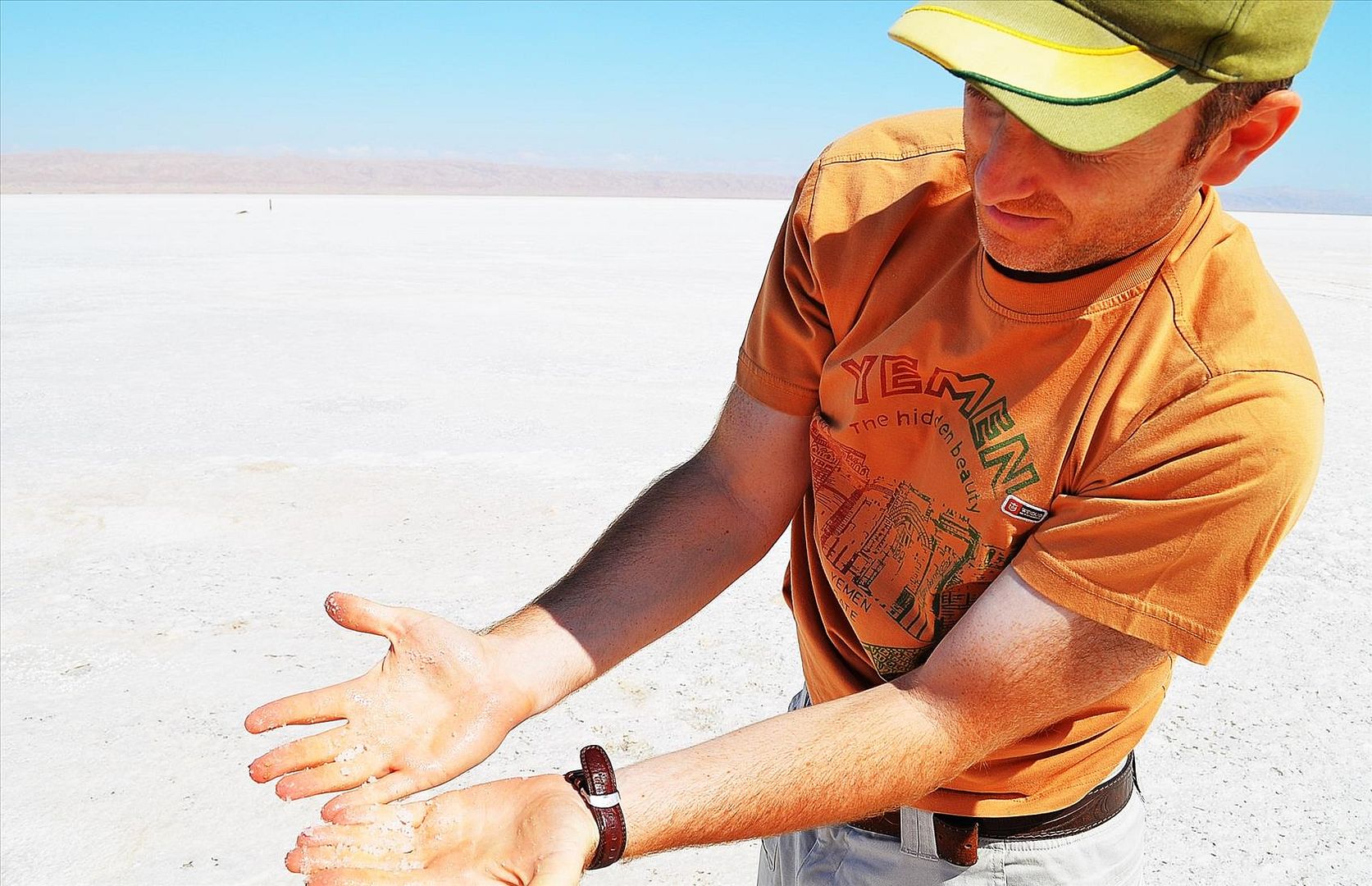 На фотографии я показываю соль, оставшуюся на руках; в тот момент, как сейчас помню, руки чертовски сильно жгло и я не мог понять почему. Уже в машине заметил, что все ладони буквально изрезаны мелкими царапинами от острых как бритва кристалликов соли, которые я не заметил вначале -