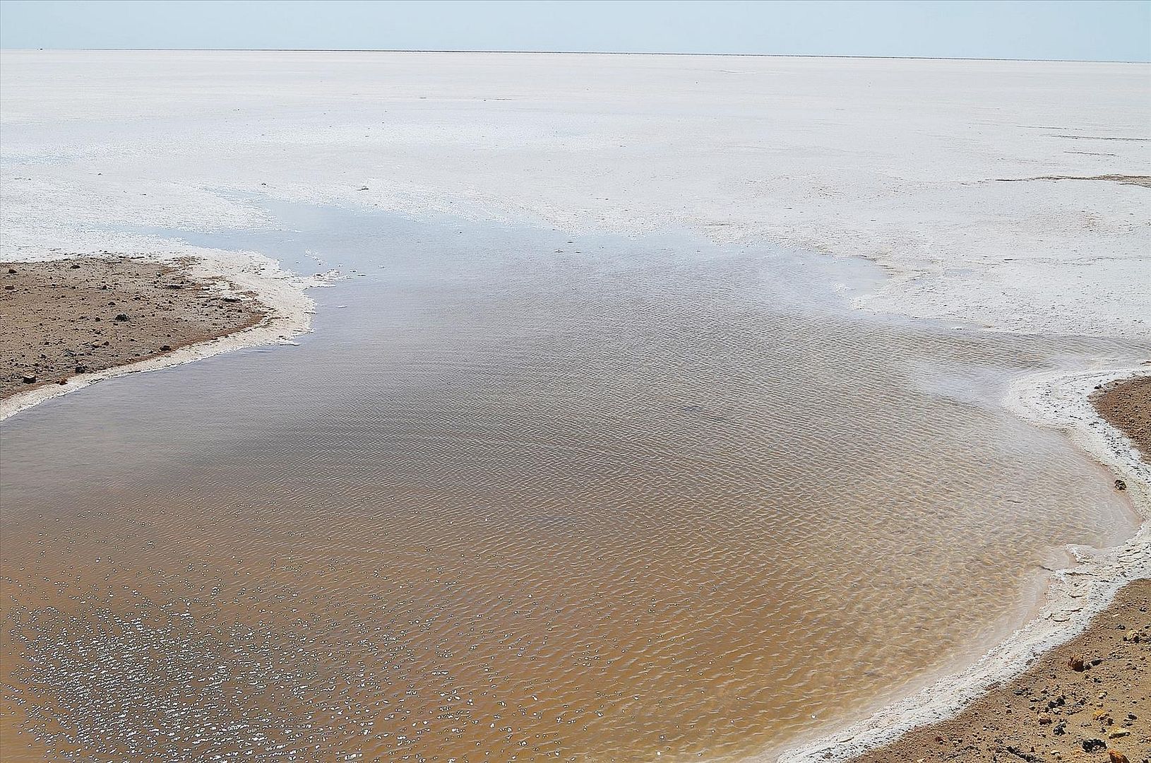 По пересохшему дну озера можно гулять, но осторожно - кой-где под коркой соли скрывается вода и вы рискуете провалиться по колено. Вода весьма едкая, ощущение, что соли тут больше, чем в Мертвом море.