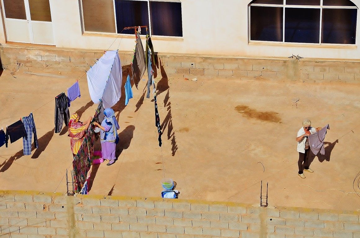 На крыше одного из домов марокканские тетушки и явно европейская бабуля вывешивают белье сушиться -
